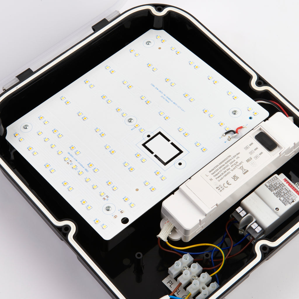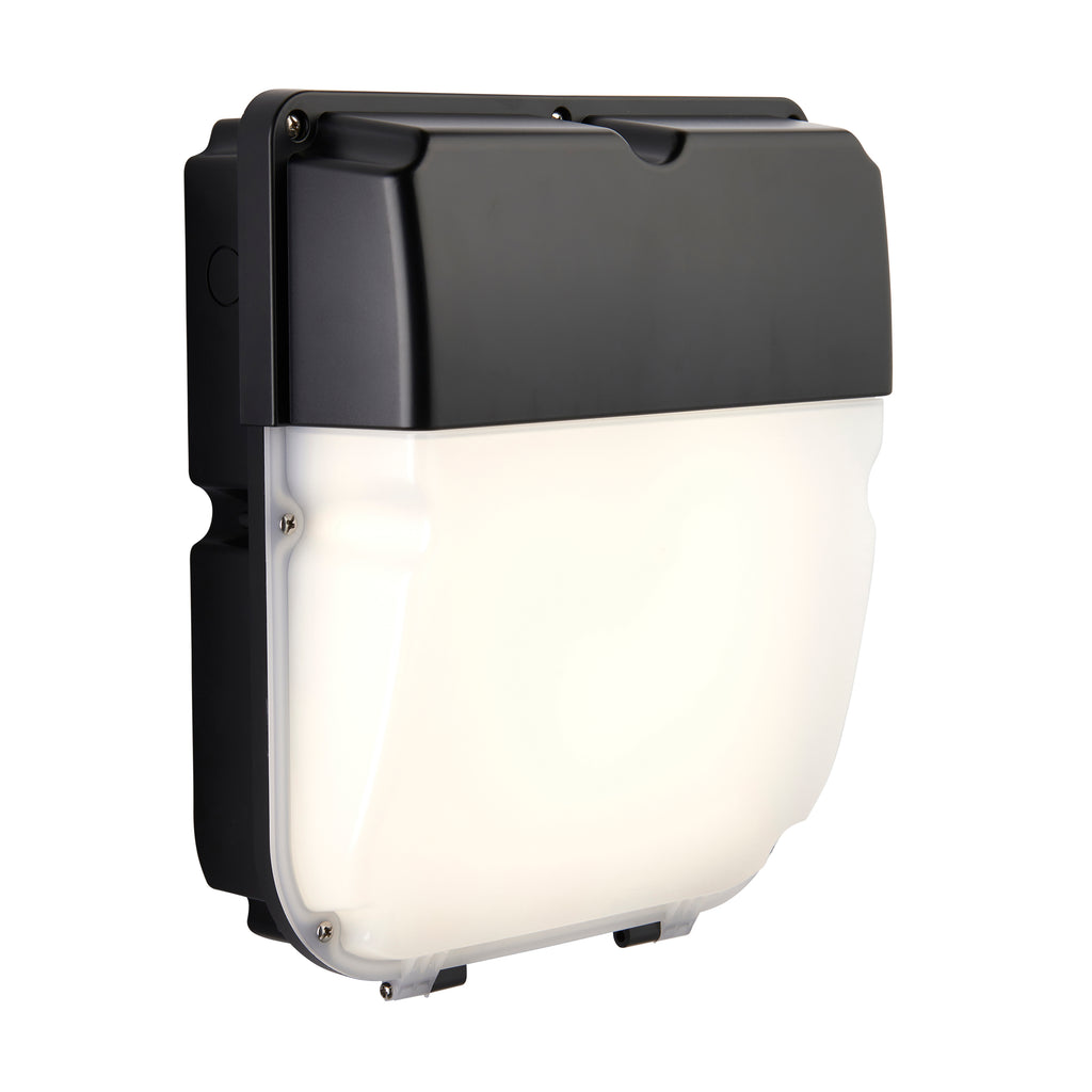 The Lucca CCT is a functional exterior wall pack which boasts Tri-Colour and Dual-Wattage capabilities and is ideal for commercial applications. Standard, Microwave and Photocell variants are available with the option of an emergency pack add in. The energy efficient fitting provides an impressive output of 3000 lumens. This range has two conduit entries, one on either side, plus an entry in the base of the fitting. Lucca CCT is IP65 & IK10 rated and constructed from polycarbonate, making it tough and hard-wearing.